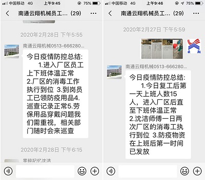 云翔機械復工復產后,每日的防疫安全定點到人,不容遺漏。從早晨進公司消毒各種場所,測量體溫,發放防疫用品,一日兩次巡查員工防疫安全措施的實施,每項工作記錄在冊。每日工作結束后,由防疫組組長胡慶菲抽樣檢查各種記錄,并做好每日防疫安全工作簡短總結,在員工群公示。復工后,云翔機械齒條齒輪訂單量足,全體員工遵循兩點間活動的生活工作軌跡,防疫復工兩手抓,企業復工運行有序。